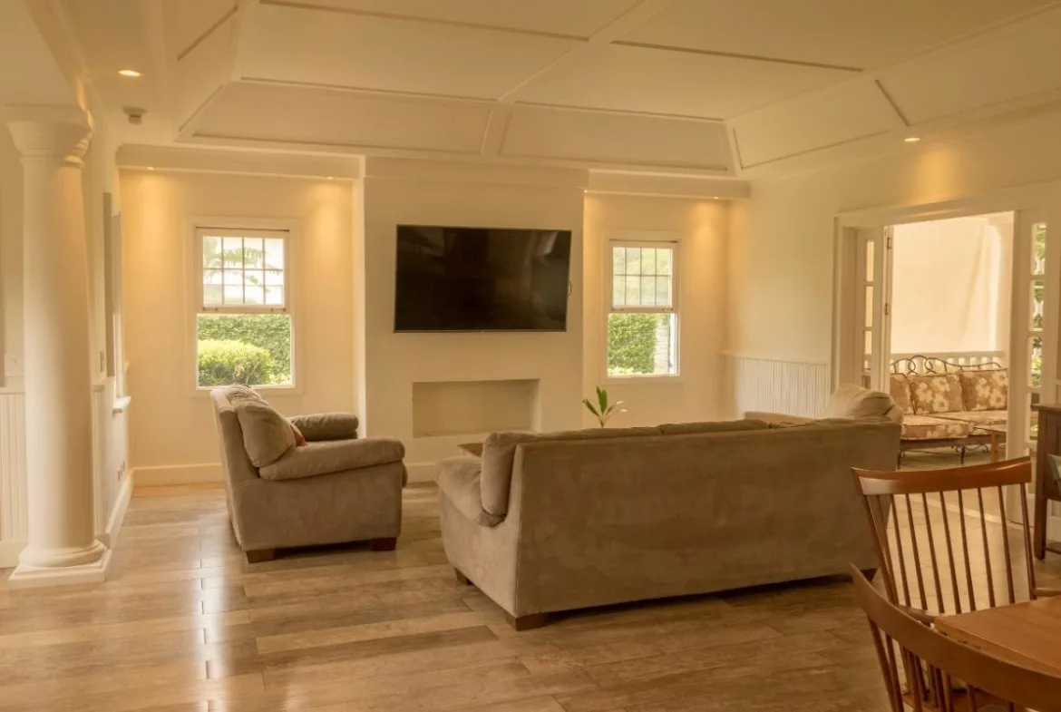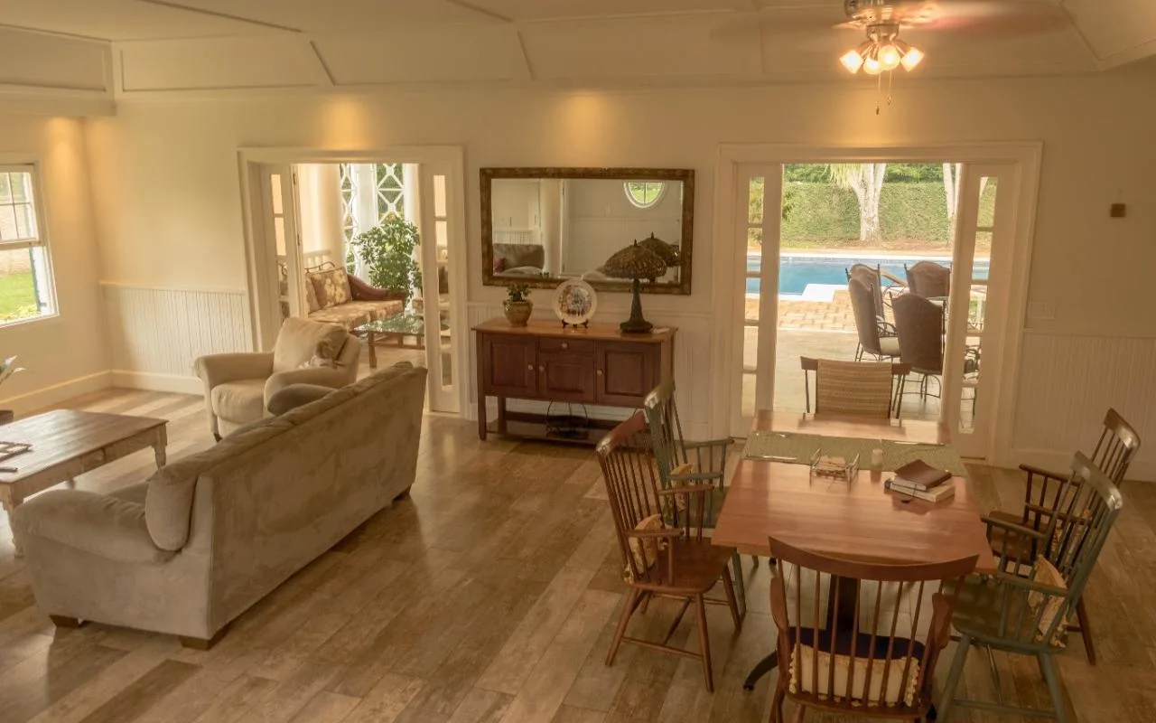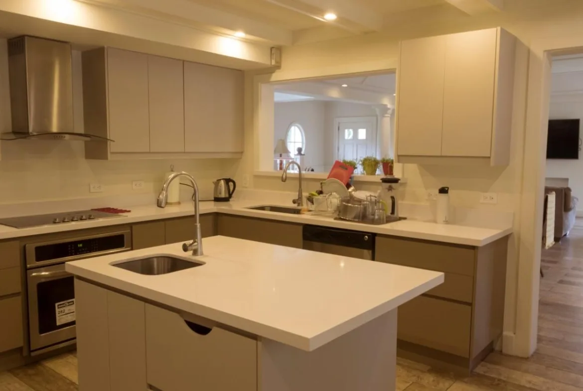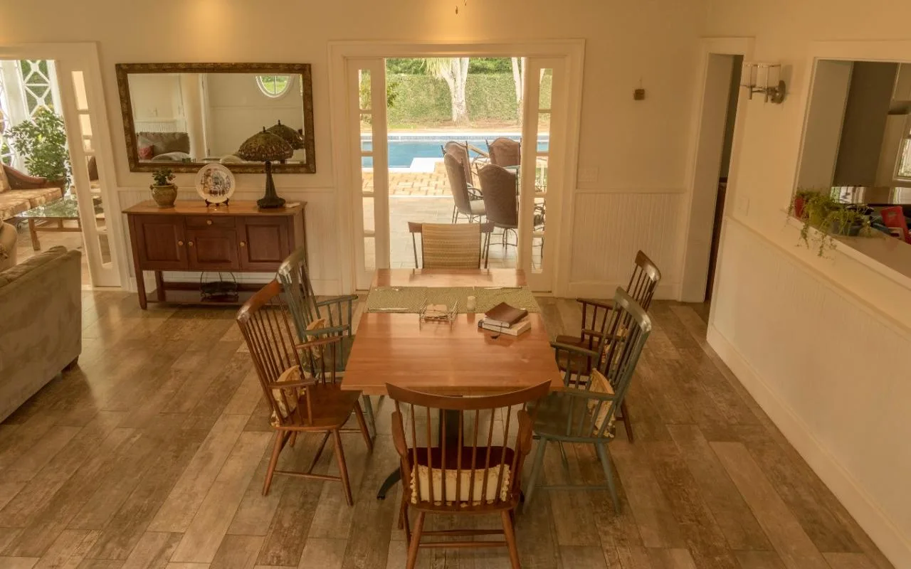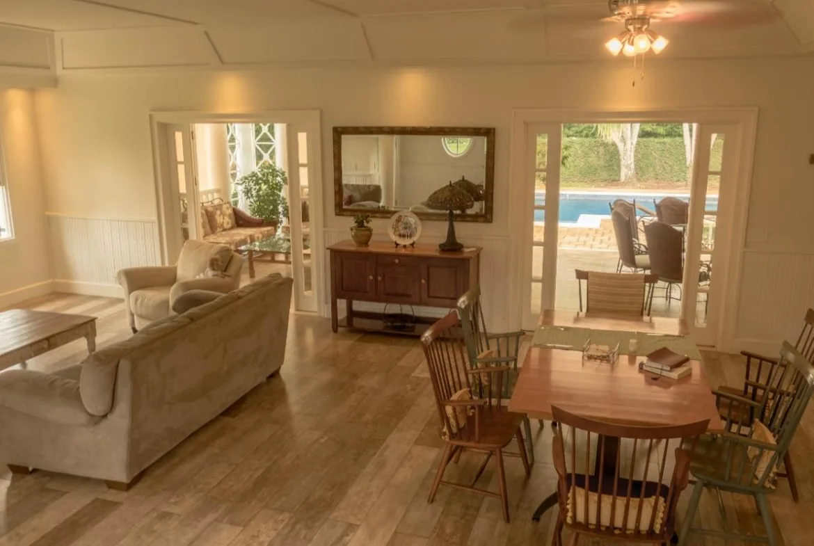 The social space has an open-concept with living, dining and integrated kitchen. This area is very luminous, it has high ceilings, and beautiful French windows and doors, and the latter directly connect to the terrace, pool area and garden, ideal for those who like the outdoors entertainment.