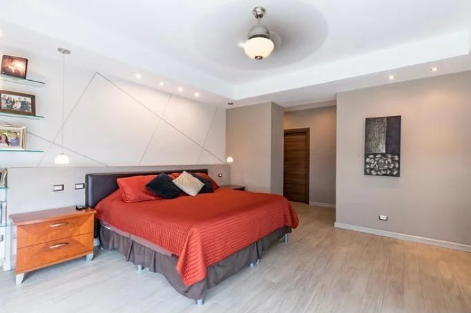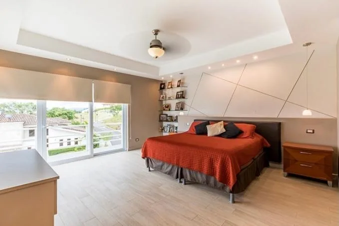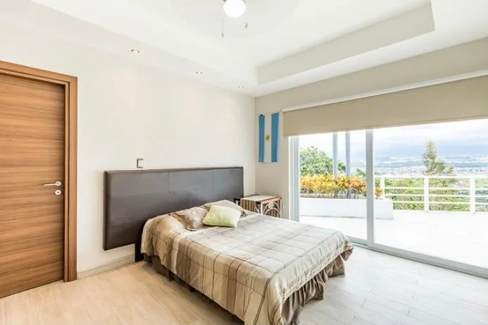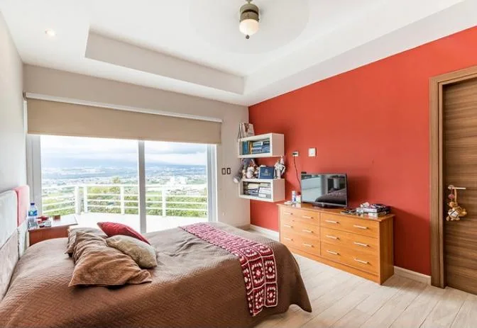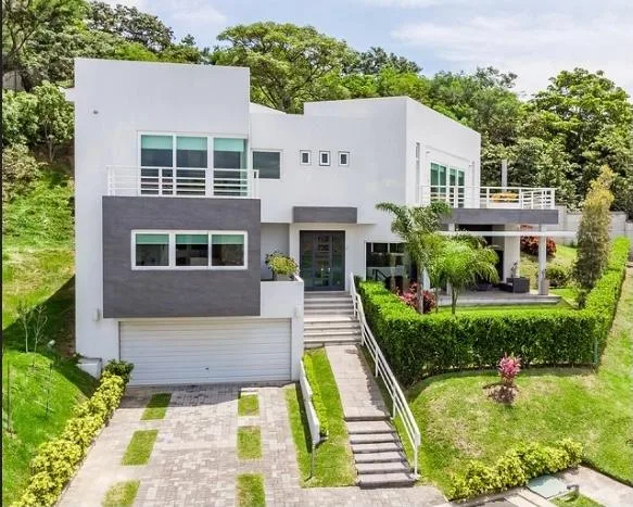 Beautiful home built on 3 levels to better seize the topography of the land and have spectacular panoramic views towards San José. The first floor presents a nice entrance lobby that opens to an ample living room, which is integrated to the terrace and small garden. Formal dining room separated by stairs, as well as the modern and luxurious kitchen, with Italian furniture and dinette. There is also a half bath for visitors.