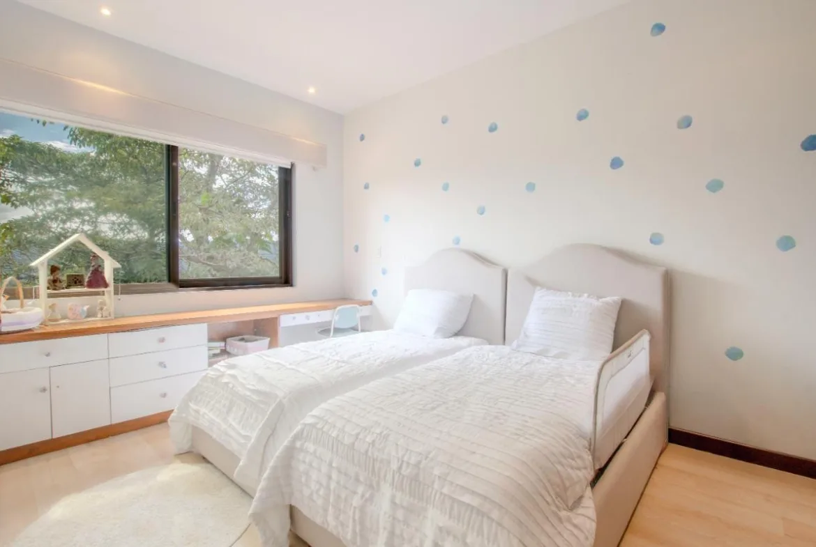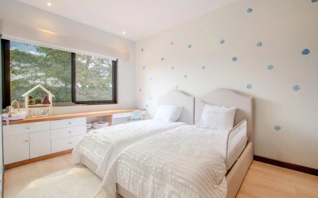 On the upper floor, the bedrooms provide a haven of privacy and comfort. The master bedroom stands out with two walk-in closets and an en-suite bathroom featuring marble finishes and an integrated audio system, transforming daily routines into a relaxing experience. The two secondary bedrooms share a bathroom with marble finishes, ensuring that every detail reflects quality and style. A family TV room with a centralized audio system connects the bedrooms, offering an additional space for family enjoyment.